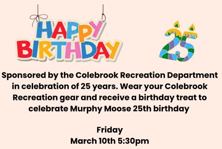 Sponsored by the Colebrook Recreation Department in celebration of 25 years. Wear your Colebrook Recreation gear and receive a birthday treat to celebrate Murphy Moose 25th birthday!